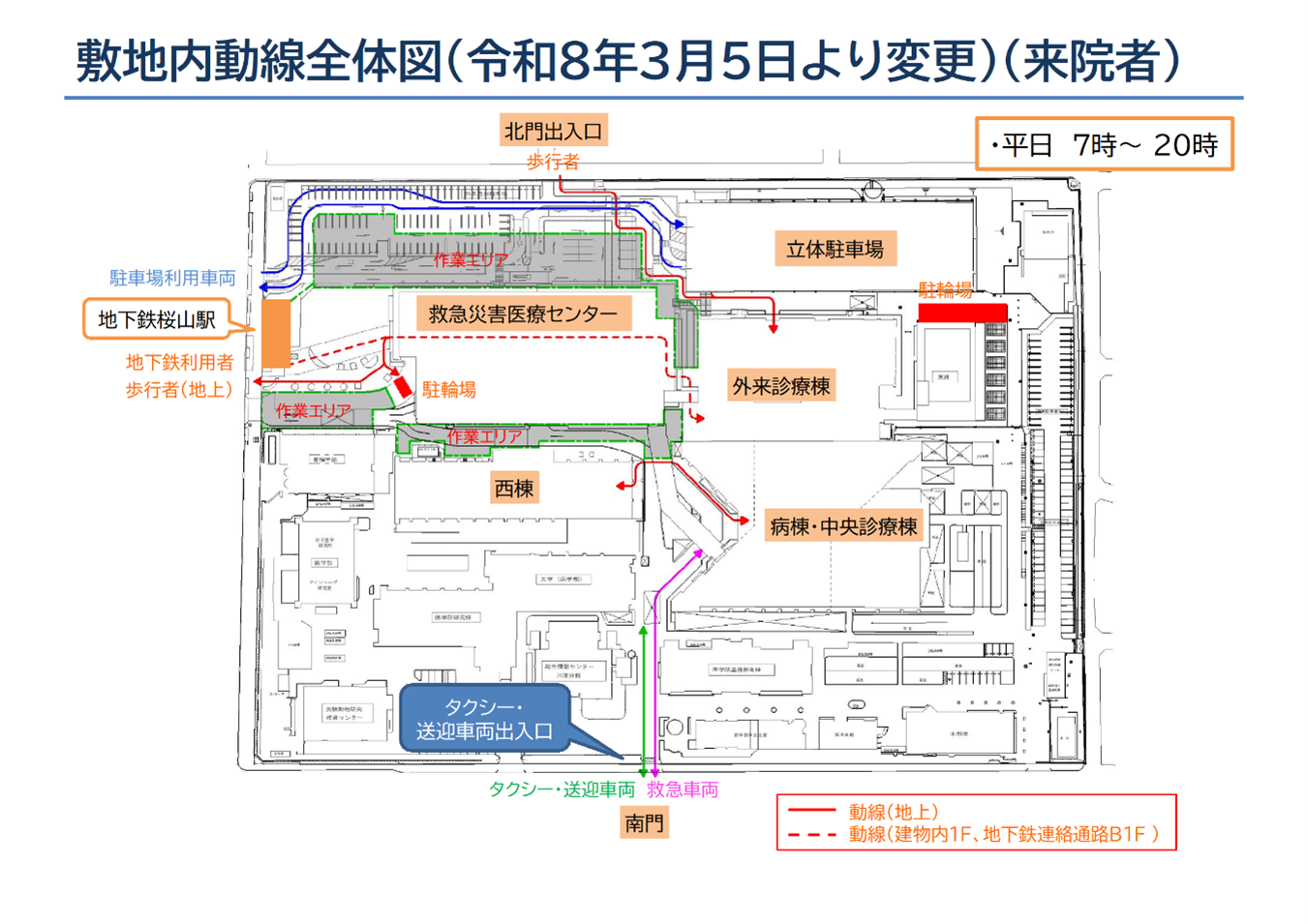 病院出入口までの動線が変更となります。平日の7時から20時まで救急災害医療センター内をご通行ください。平日の20時から7時、及び土曜日、日曜日、祝日は西棟南側をご通行ください。