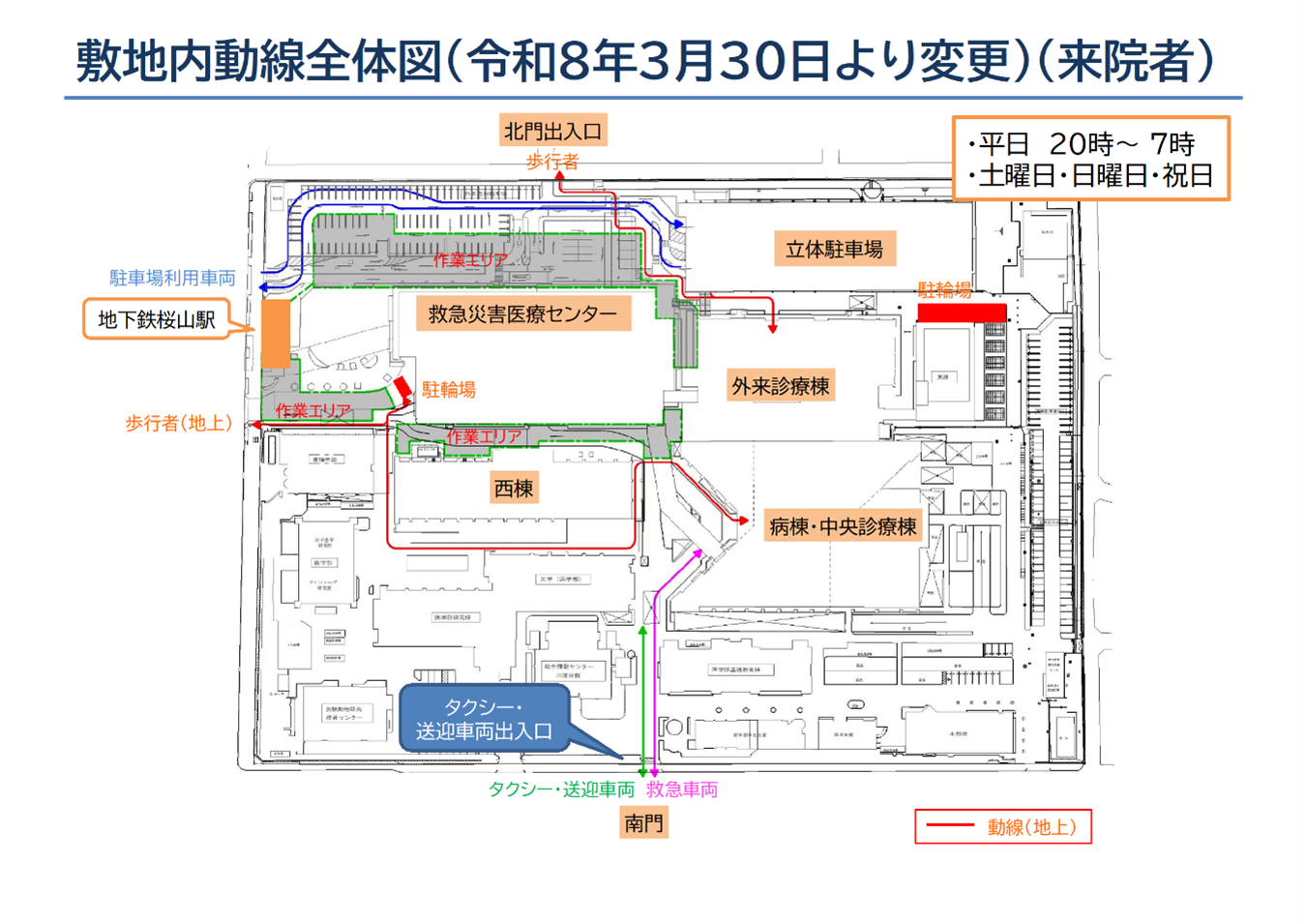 病院出入口までの動線が変更となります。平日の7時から20時まで救急災害医療センター内をご通行ください。平日の20時から7時、及び土曜日、日曜日、祝日は西棟南側をご通行ください。