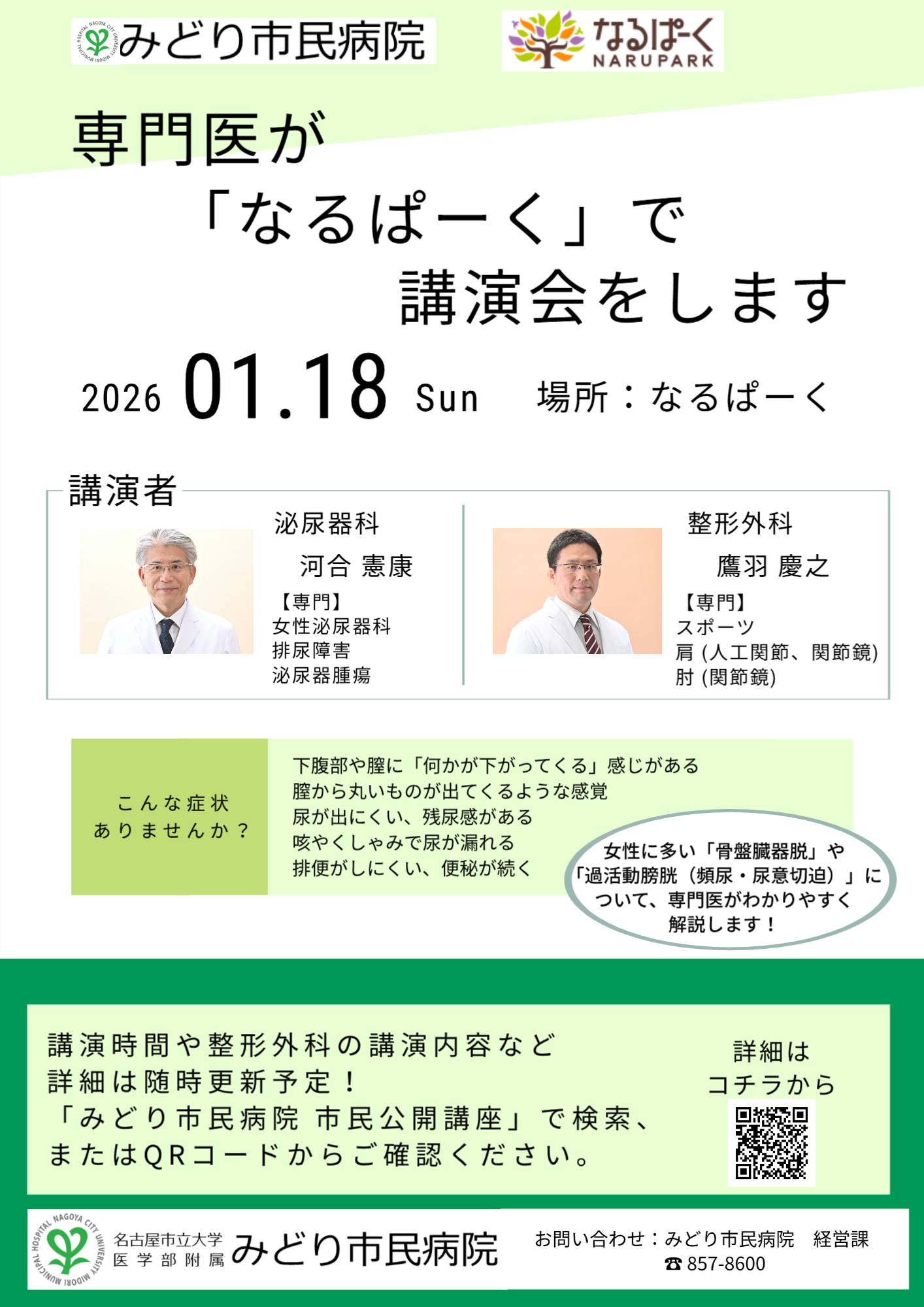 講演内容: 女性に多い「骨盤臓器脱」や「過活動膀胱(頻尿・尿意切迫)」について、わかりやすく解説します!