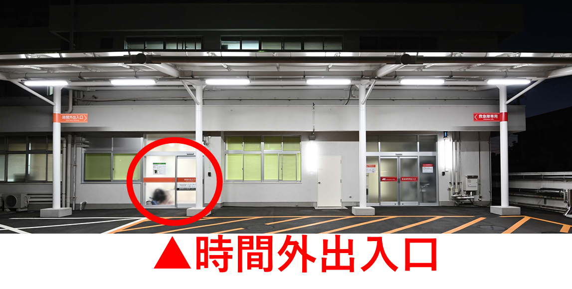 「時間外出入口」のご案内 下記日時において、患者さんはじめ、ご面会など御用の方は写真下赤丸の部分からお入りいただき、救急外来受付へお申し出ください。 【日時】 平 日 17:15~翌 7:30 土日祝 24時間
