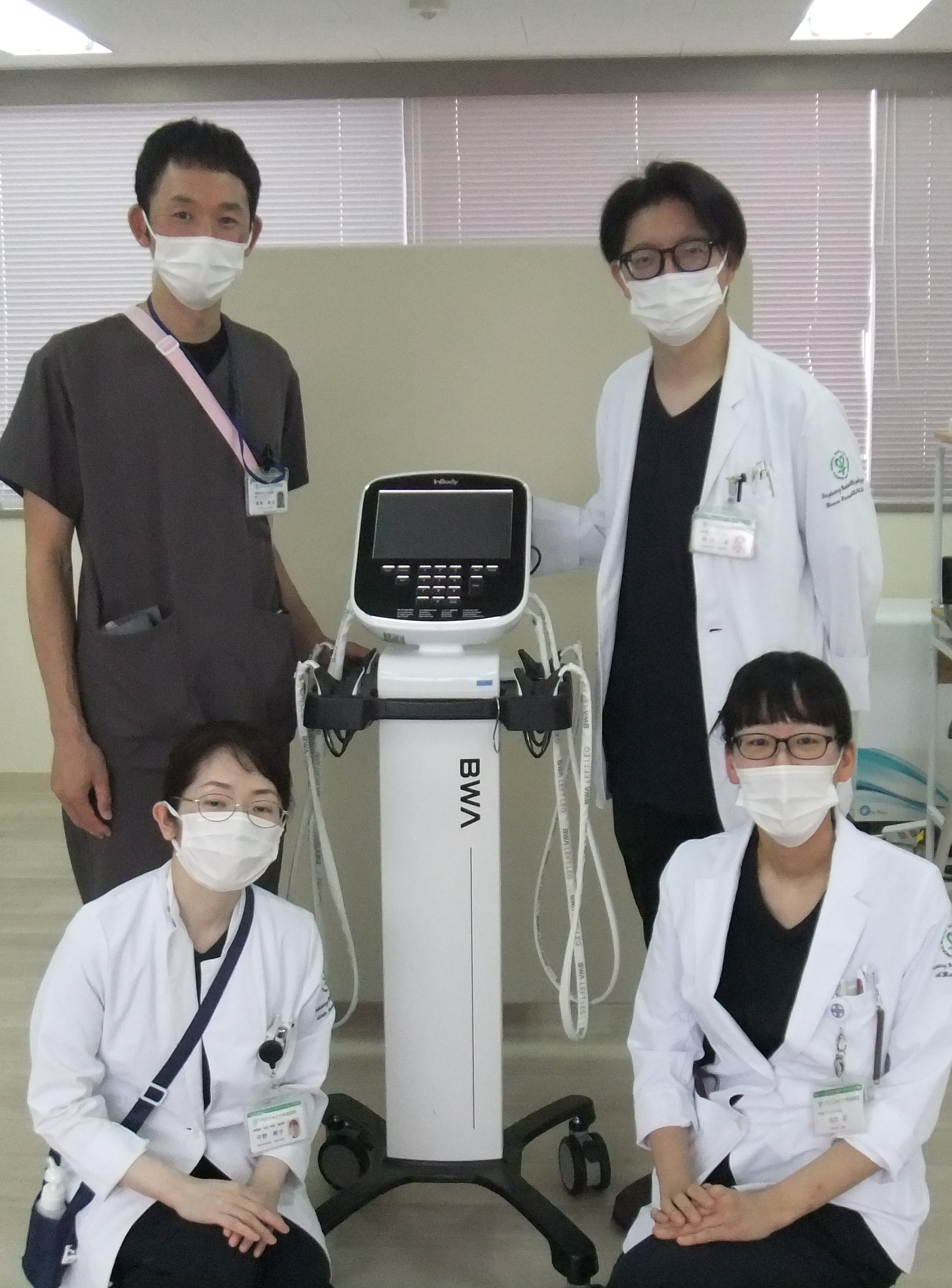 診療はほぼすべての呼吸器疾患に対応しますが、先進的な医療としてサルコペニア・フレイル対策医療を行っています。呼吸器の代表疾患であるCOPD、間質性肺疾患、重症喘息の方ではサルコペニア・フレイルの頻度が一般住民の約4倍以上に多いことが知られています。息切れのため、健康な頃に比べると運動量はどうしても落ちてしまします。サルコペニア・フレイルになると、死亡率が上昇することも知られています。当院では最新の移動型の生体電気インピーダンス装置を導入し、サルコペニア・フレイルの診断を行っています。なるべく早い時期から予防あるいは克服していくことが大切です。サルコペニア・フレイルの予防と克服策は、呼吸器疾患の薬物療法に加え運動(リハビリ)・栄養・社会参加が3本柱です。また当院では器具を用いた吸気筋トレーニング、呼気筋トレーニングの研究を行っています。