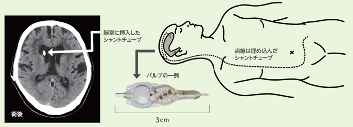 手術は脳室もしくは腰椎腹腔シャント術といって、髄液の貯まる空間と髄液を逃がす腹腔を、流量調整が可能な精密機械(バルブ)を有したチューブでつなぐ手技です。バルブの種類によってはMRIで設定がずれるため都度調整を要するものがありますが、当科では原則MRIの撮影に影響を受けないシステムを用いて患者さまへの負担軽減を図っています。