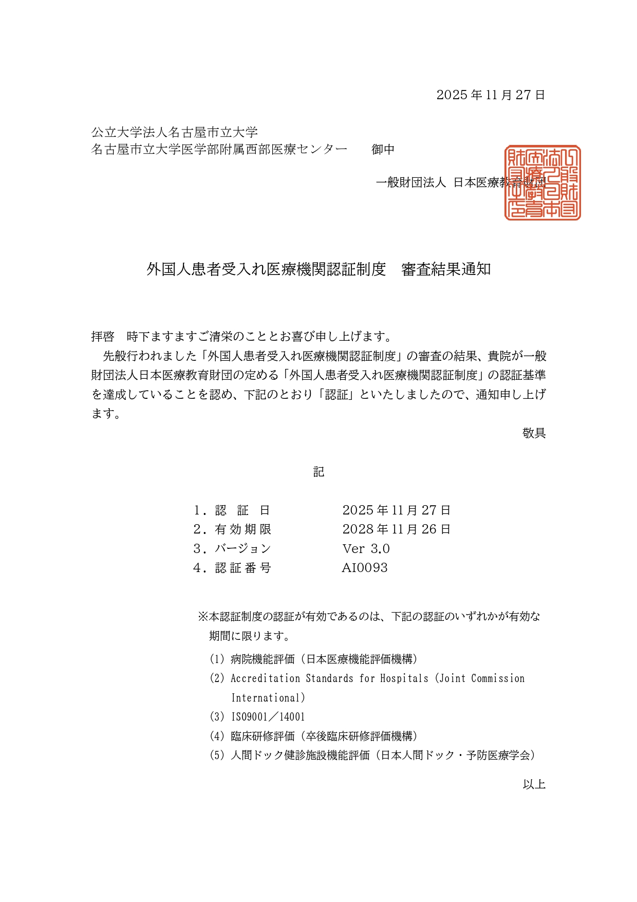 当院は、2025年11月27日に一般財団法人 日本医療教育財団による「外国人患者受入れ医療機関認証制度JMIP(Japan Medical Service Accreditation for International Patients : ジェイミップ)」の認証を受けました。