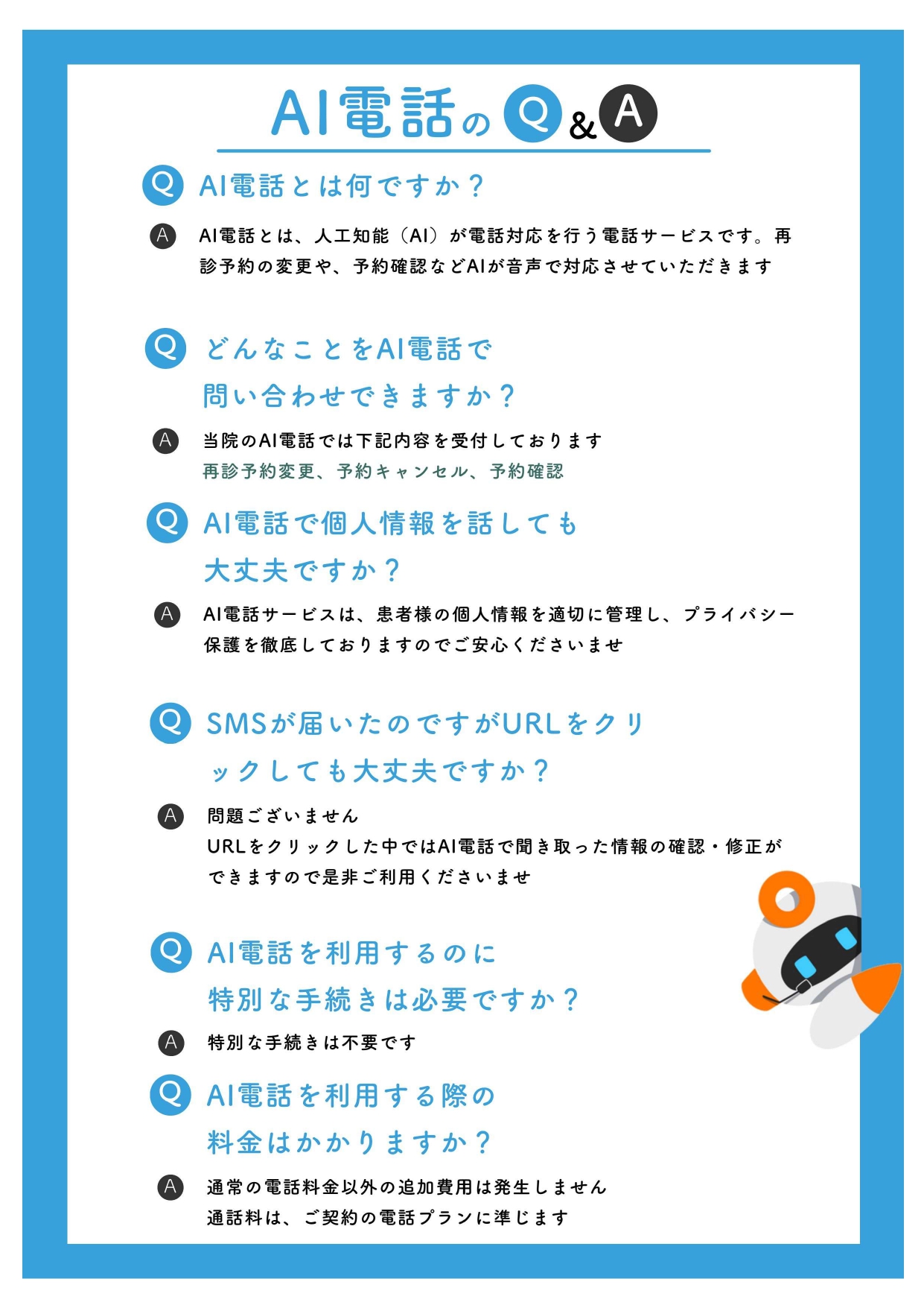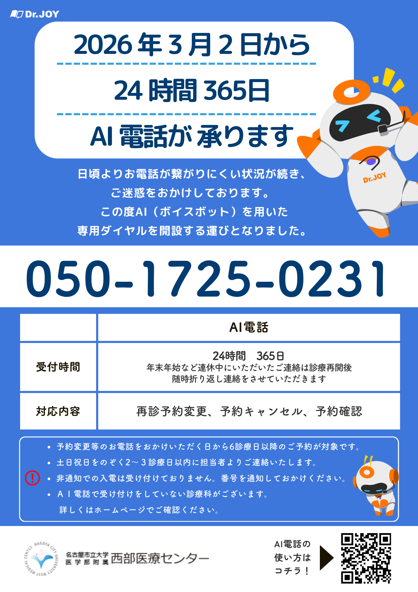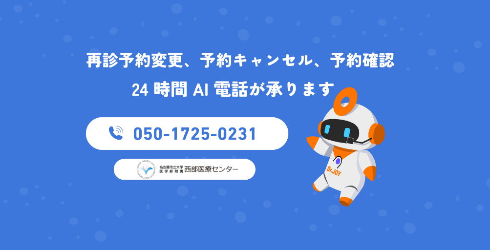 2026年3月2日(月)より、再診予約変更、予約キャンセル、予約確認のお問合せを専用AI回線が24時間365日承ります。
