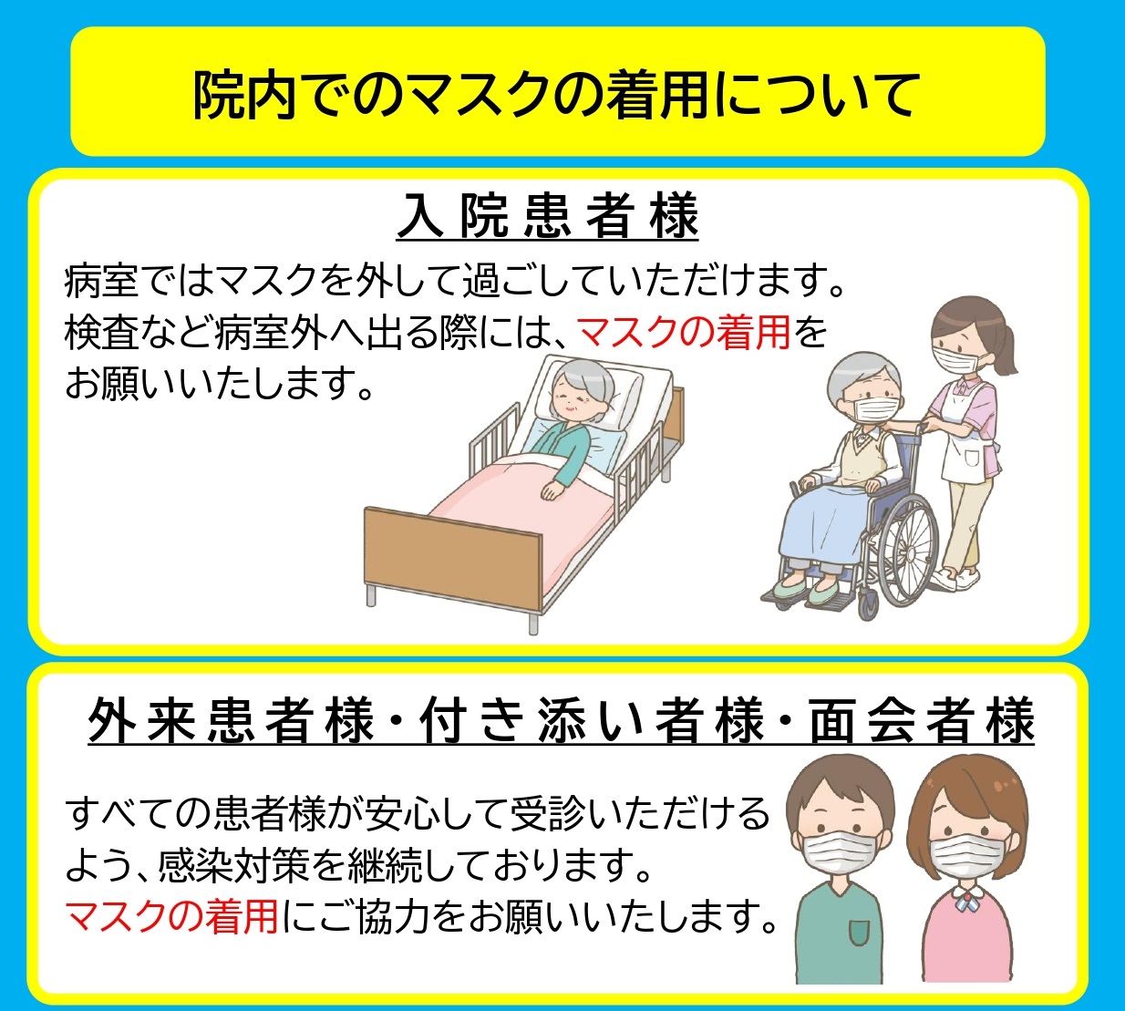 医療機関には高齢者を始めとした重症化リスクの高い方がたくさん来院されることから、これまで通り、外来受診、入院患者さまへの面会、ご家族様及び付き添いの方等で来院される方は、マスクを着用の上ご来院いただきますよう、お願いいたします。