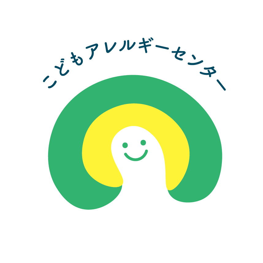 ロゴマークは、真ん中のこども(白)を、家族(黄)がやさしく包みこみ、さらにその周りをこどもアレルギーセンター(緑)が大きく見守っている姿を表しています。