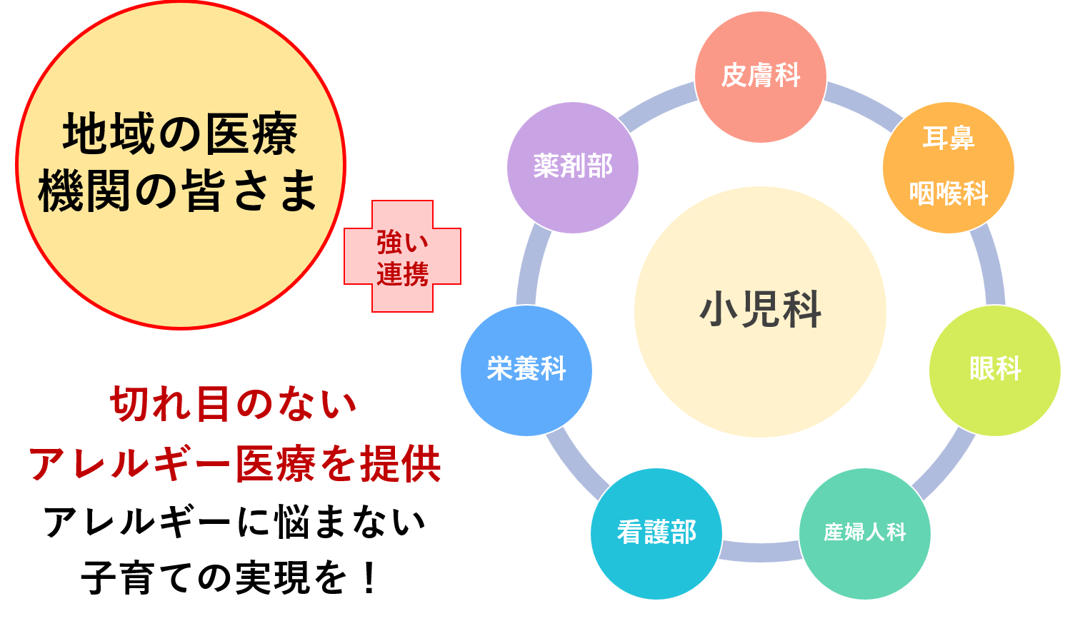 看護師、薬剤師、栄養士、助産師など多職種も加わることで、こどもとご家族が安心して過ごせる環境づくり、アレルギーに悩まない子育ての実現を目指します。