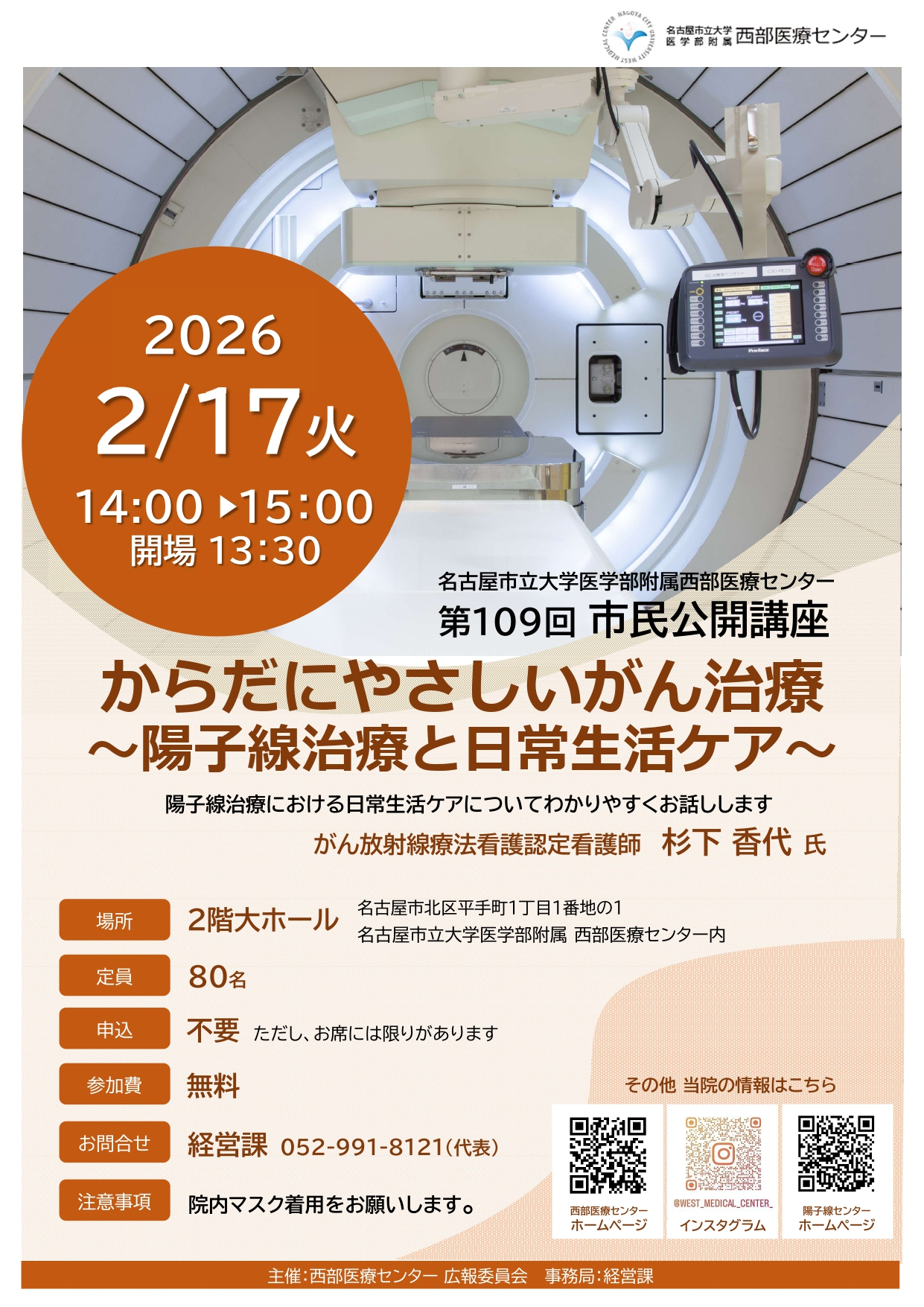 【2月17日(火)】市民公開講座開催のお知らせ 2月17日(火)当院2階大ホールにて、市民公開講座を開催いたします。 日時:2026年2月17日(火)14:00~15:00(開場:13:30) 場所:当院 2階大ホール 講師:当院 がん放射線療法看護認定看護師 杉下 香代 氏 定員:80名 申込:不要(だたし、席には限りがあります。) 参加費:無料 【講義内容】 陽子線治療における日常生活ケアについて、認定看護師がわかりやすくお話しします。 ご興味ある方はぜひお越しください。 ※院内ではマスク着用をお願いいたします。