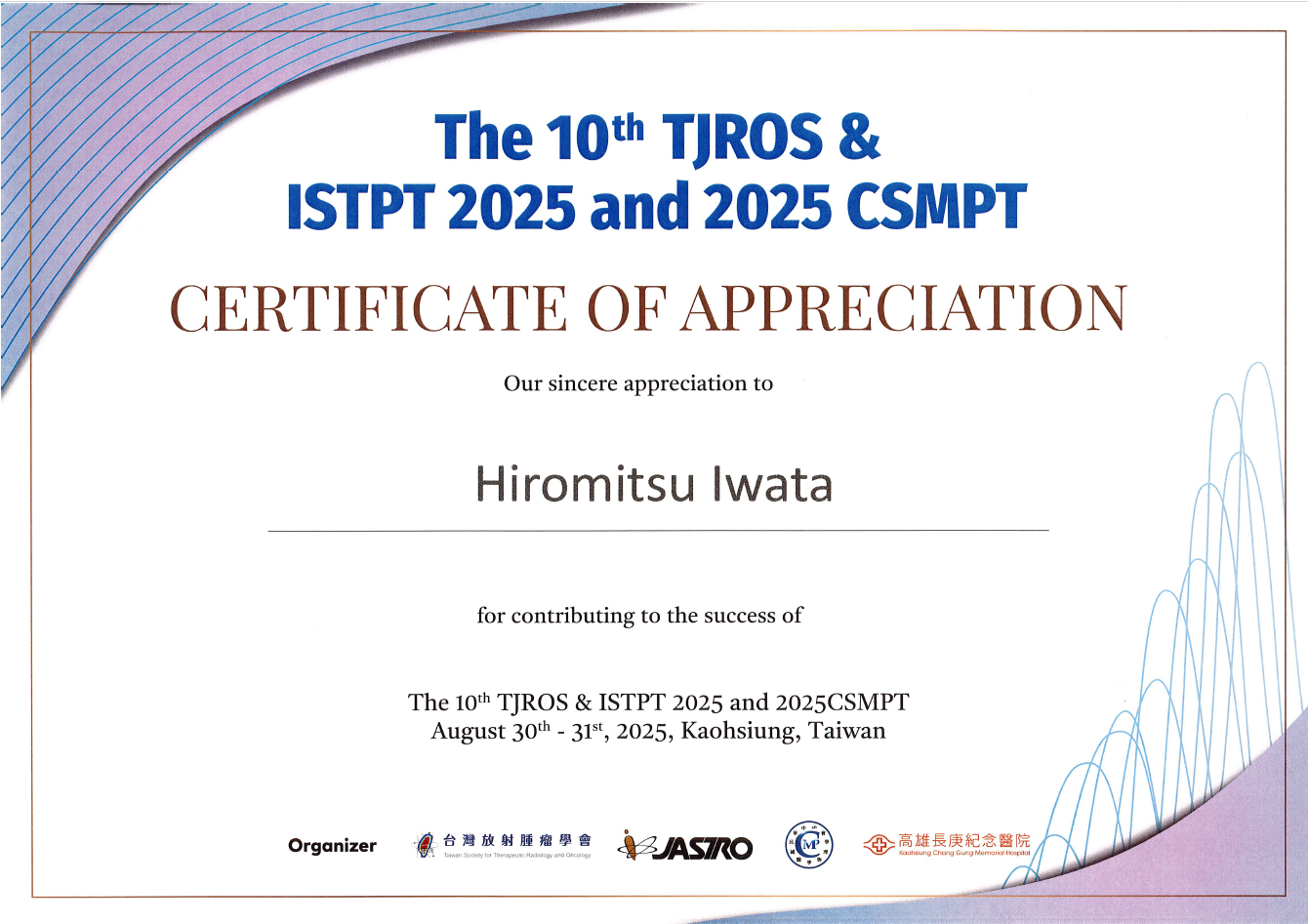 当センターの岩田宏満医師が、台湾・高雄市で開催された第10回 台日放射線腫瘍学シンポジウムおよび第4回 台湾粒子線治療国際サミットならびに2025年 中華民国医学物理学会 学術大会において、JASTRO(日本放射線腫瘍学会)とTASTRO(台湾放射線腫瘍学会)が共同開催したセッションに招待を受け、講演・座長をいたしました。