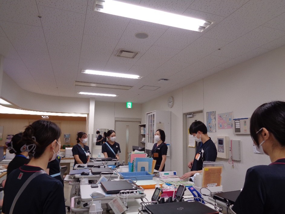 - ICUには、ハイリスクな手術後の患者や重症肺炎などから人工呼吸器を装着している患者が入室しており、毎朝医師・コメディカルによるカンファレンスが行われています。