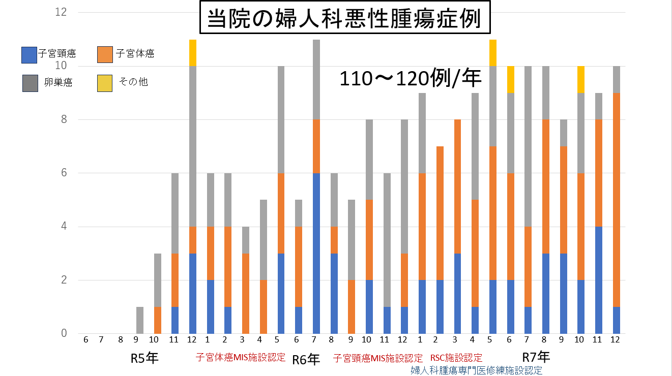 当科は2023年9月より、悪性腫瘍診療を主体とし、先進かつ高水準な診断治療を提供する、包括的な婦人科腫瘍センターとして新たにスタートしました。 2023年9月より婦人科腫瘍専門医2名が着任し、既に140件を超える悪性腫瘍診療を手掛けております(2025年3月現在)。最新のPARP阻害剤、免疫チェックポイント阻害剤、マルチキナーゼ阻害剤を用いた薬物療法も積極的に施行しています。総合病院の強み(関連する内科、外科の強力なサポート体制)を生かした総合的な診療体制を組んでいます。また、当院の強みとして救急医療体制が盤石であることがあげられます。現在の進行癌治療は、従来の抗癌剤だけでなく、PARP阻害剤や免疫チェックポイント阻害剤等を用いるため、有害事象が多岐にわたる事があります。そのため救急対応が必要となる場合もあります。副作用による急変等にも、高度な救急医療体制を有している当院では速やかに対応することが可能です。