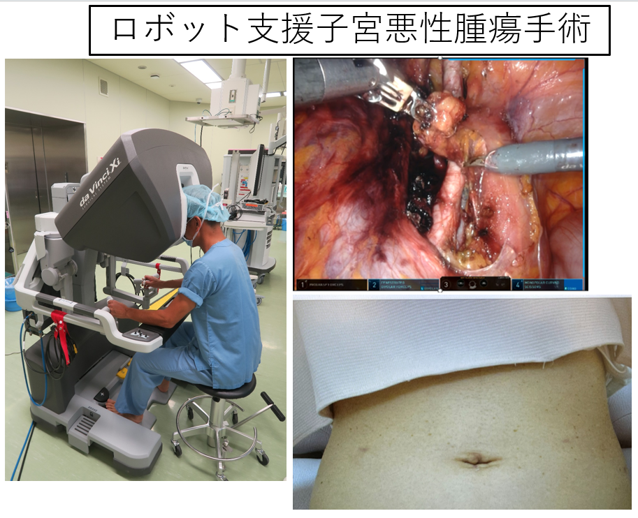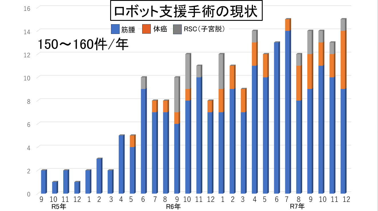 当院、産婦人科は悪性腫瘍診療、ロボット支援手術に力を入れています。婦人科腫瘍専門医が2023年9月に2名着任後、婦人科悪性腫瘍に対する最新の低侵襲手術(ロボット支援子宮体癌手術、腹腔鏡下広汎子宮全摘術)が可能となり、精力的に症例数を伸ばしています(図1)。また、低侵襲手術は従来の腹腔鏡から更なる精密手術を求めてロボット支援手術に切り替えております。(図2)。最新の分子標的薬を用いた薬物療法もすべて当院で実施可能です。総合病院(充実した内科、外科のサポート)の強みを生かした総合的な悪性腫瘍診療が可能です。従来の良性疾患(子宮筋腫、卵巣腫瘍)だけでなく、骨盤臓器脱のロボット支援手術(RSC)も積極的に行っています。周産期領域も低リスク中心ですが、安心、安全な分娩が行えるよう、チーム一丸となって診療しています。2024年の手術件数は736件、ロボット手術件数は109件でした。