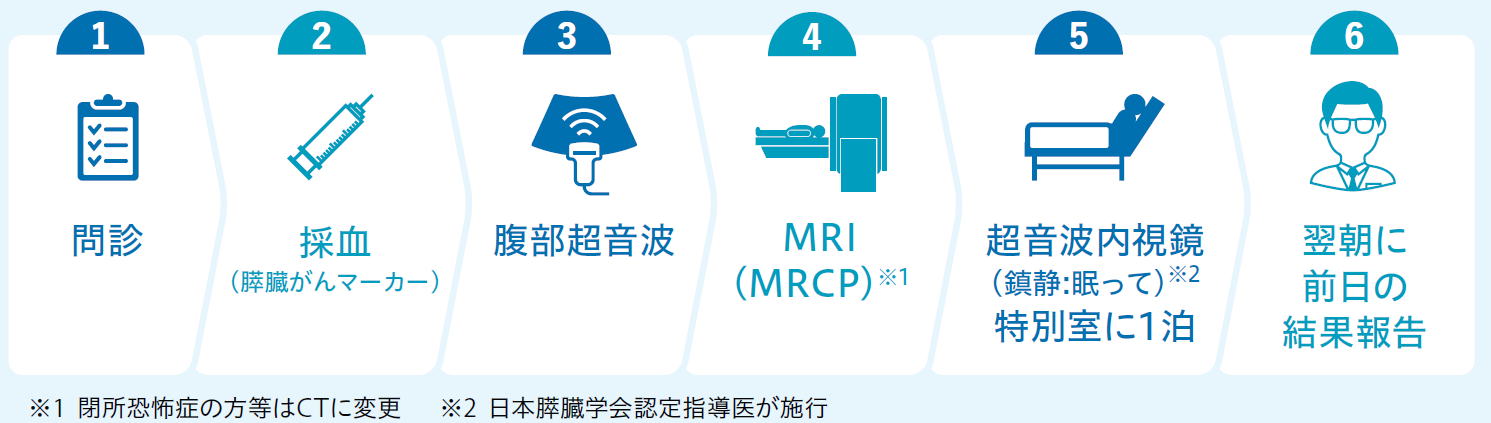 腹部超音波検査に加えて、膵がんの早期発見に有用とされる、MRI(MRCP)と超音波内視鏡検査を取り入れています。