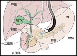 超音波内視鏡は内視鏡の先端に超音波装置があり、胃や十二指腸から膵臓を観察します。