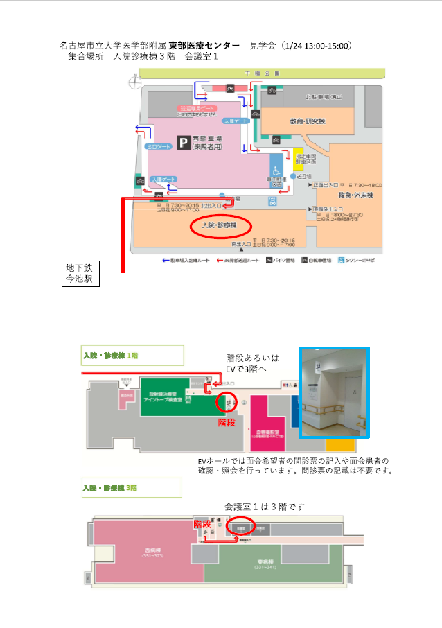 | 集合場所 | 西部医療センター:4階 集団指導室 東部医療センター:入院・診療棟3階 会議室1 名古屋市立大学病院:病棟・中央診療棟10階 第4会議室 |